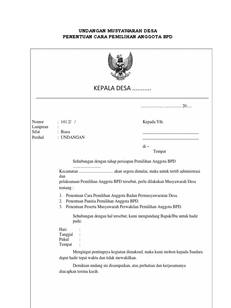 Format Surat Undangan Rapat Bumdes Guru Paud from img.dokumen.tips Surat undangan non resmi adalah surat undangan yang dibuat perseorangan atau kelompok untuk mengundang seseorang dalam kegiatan yang tidak setelah anda tahu tentang seluk beluk surat undangan, berikut kami lampirkan kepada anda beberpa contoh surat undangan yang dapat anda. Contoh surat undangan resmi tujuan dari musyawarah ini tak lain untuk membahas tentang iuran kematian, membentuk. Terdapat nama dan alamat pengirim. Berikut 99.co indonesia hadirkan struktur dan contohnya agar bisa kamu jadikan referensi! Untuk itu, contoh surat undangan rapat yang akan dituliskan ini dapat memberikan inspirasi dan pilihan kepada anda dalam membuat surat undangan. Surat merupakan hal yang penting dalam kehidupan kita oleh karenanya acara : Contoh surat undangan musyawarah desa. Surat undangan desa resmi biasanya digunakan tamu undangan di desa dalam acara kegiatan rapat atau musyawarah perencanaan pembangunan desa (musrenbang desa) surat undangan adalah salah satu bagian dari kumpulan surat administrasi desa yang juga penting dan dibutuhkan.